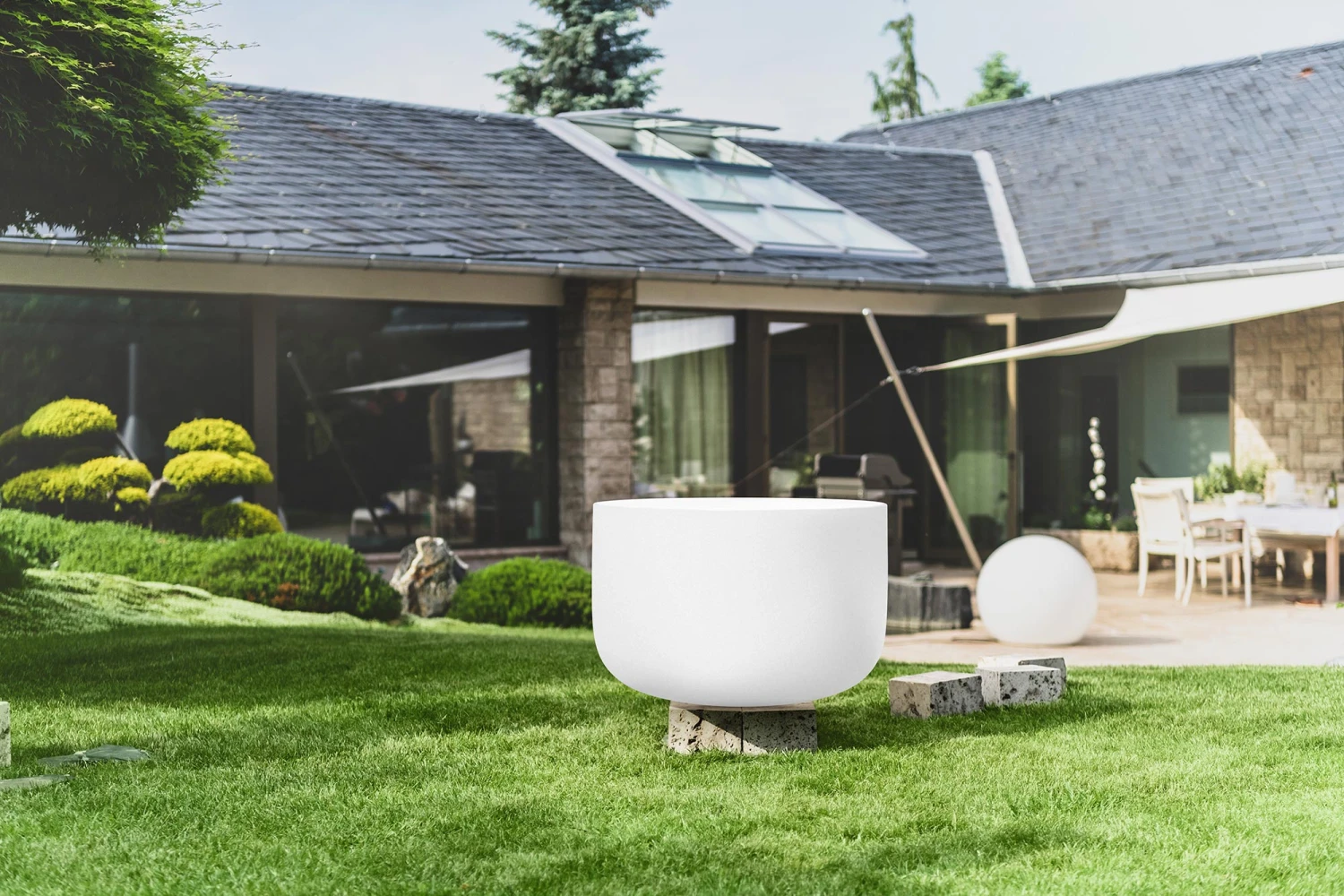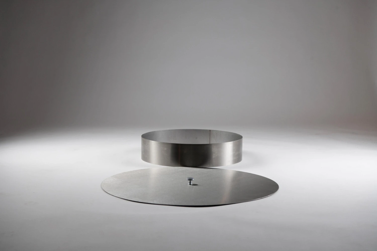QBase – ein runder Sockel mit 15 cm Höhe und einem Durchmesser von 45 cm aus rostfreiem Edelstahl ist im Lieferumfang enthalten. Alternativ die QBase aus feuerfestem Beton – ein außergewöhnliches Design mit einer durchdachten Formgestaltung und einer Dreipunkt-Auflage. - QLid-Deckel aus Edelstahl