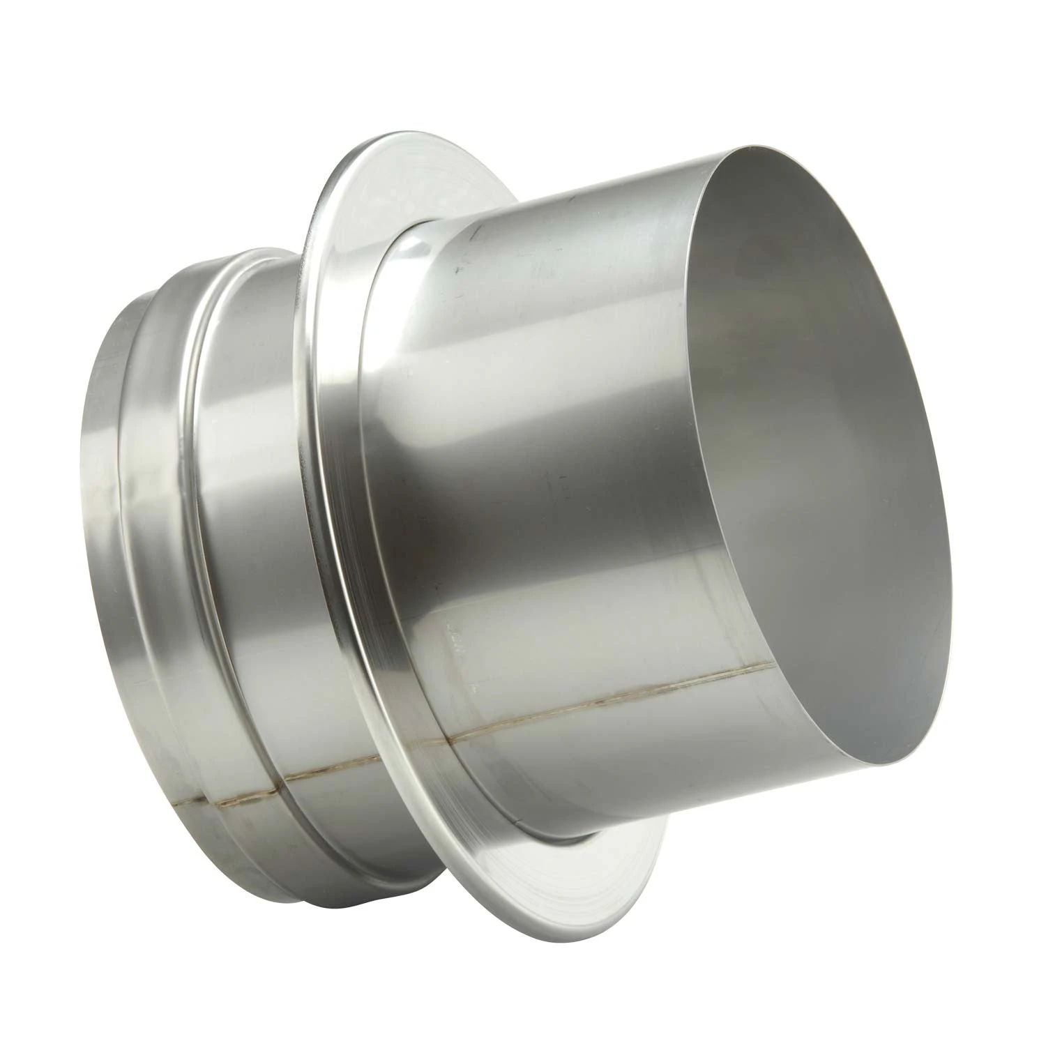 Übergangsstück mit Abdeckung der Wärmedämmung von doppelwandig auf einwandig aus hochwertigen V4A Edelstahl in wählbaren Querschnitten 113-400 mm in der Materialstärke: Innenschale 1 mm, Außenschale 0,6 mm für 50 mm Wärmedämmung zum Anschluss eines einwandigen Edelstahlrohrs (Rauchrohr, Verbindungsleitung) an einen doppelwandigen Edelstahlschornstein.